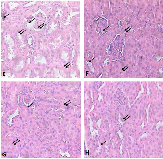 Histopathological studies showed that nickel-induced proximal tubule degeneration and tubular necrosis (double arrows), multiple foci of hemorrhage and inflammation with the presence of lymphocytes in interstitial tissue (single arrow) (fig. 3E). Indeed, pathological lesions induced by Ni were remarkably reduced by the administration of vitamin C or vitamin E, but both vitamins along with Ni proved to be more efficient in reducing nickel-induced severe tissue alterations (fig. 3F-3H).