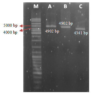 Fig. 1: Isolated plasmids were digested by restriction enzyme BamHI of isolated DNA. M refers to Marker, A and B refer to E. coli DH5α and as host of the plasmid, respectively, C refers to plasmid of pET9a. red arrow showed the molecular weight of the marker