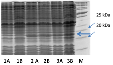 Fig. 2: SDS PAGE of E. coli strain BL21 CP pellets non-induced and induced by 1 mmol IPTG 1 mmol before (A) and after (B) induction. 1 refers to E. coli BL21 CP only, 2 refer to transformed by pET9a, and 3 refer to transformed of B by pET9a contained the Apoptin gene. M refer to marker; blue arrow showed the expressed of apoptin