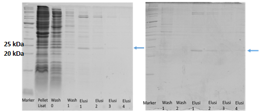 Fig. 3: SDS-PAGE of E. coli BL21 CP purification result (left) and BL21 pLysS (right). Blue red shown the molecular weight of apoptin