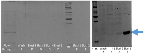 Fig. 4: Protein purification in denaturing condition of E. coli BL21 CP contained pET9a (left) and pET9a-apo (right)