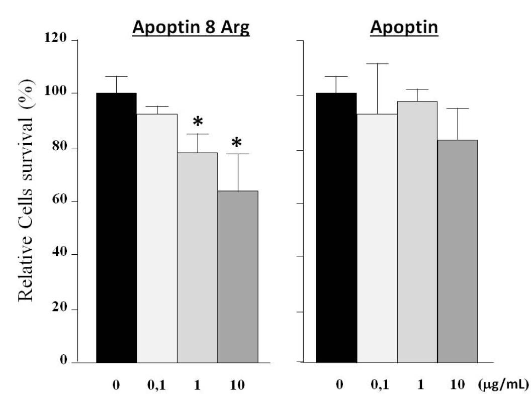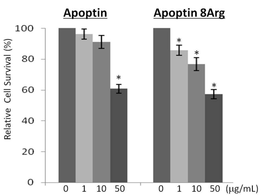 Fig. 5: Growth inhibition of HeLa cells treated with Apoptin 8 Arg and its control at different concentrations. *P<0.05 compared with apoptin group