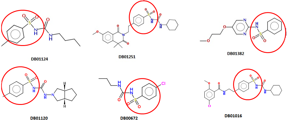 Fig. 1: Structure of six sulphonylurea drugs, the common unit has been encircled. Apart from the common aromatic ring, similar to peptide bonds, CO-NH groups are placed in trans conformation in five drugs