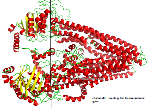 Fig. 2: Predicted structure of target protein represented in cartoons form, distinct helix bundle structure expected to form the transmembrane region is observed. Helix regions shown in red colour constitute 56.2% region of the structure, yellow colored strands form 7.6%