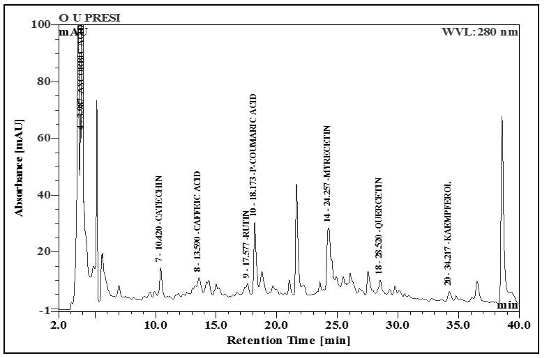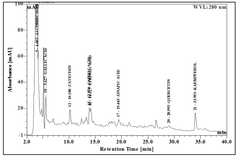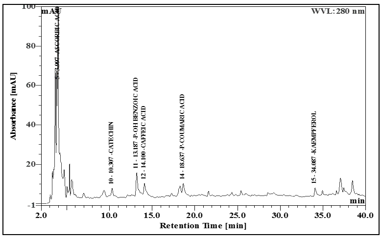 The phenolic compounds present in the extracts of O. virens, O. thyrsoides and O. dubium were analyzed by HPLC and chromatograms generated are given in fig. 1, fig. 2, and fig. 3 respectively. Identification of the constituents was done using 13 phenolic acid and flavonoid standards as depicted in table 3. apigenin, Methyl gallate, and Ferulic acid was found absent in all three extracts, on the other hand, catechin, caffeic acid and kaempferol were present. O. thyrsoides was found to contain least components in comparison to other two species.