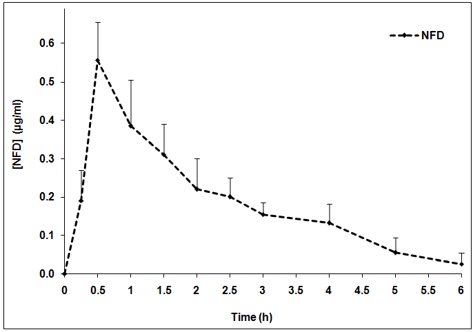 It is evident that the plasma concentration of NFD after the oral administered dose was low indicating low oral bioavailability of NFD when administered orally. However, the presently developed method is highly sensitive to detect the plasma concentration-time profiles for a drug with well-known low oral bioavailability (0.47-0.82%) [41]. HPLC method developed in this paper is applicable for the determination of NFD in vivo studies of different kind of NFD drug delivery dosage forms [42].