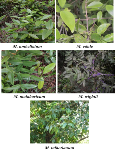 The genus Memecylon L. belongs to family Melastomataceae, which is used for medicinal purposes in Asia-Pacific regions [1]. Itconsists of more than 300 species, mainly in the Old World tropics. In India, the genus is represented by about 40 species (table 1) out of which 21 are endemics [2].The Western Ghats is the major centre of Memecylon diversity with 27 species, including 20 endemics confined to this biodiversity ‘hotspot’ [3]. The genus Memecylon is associated closely to Syzygium R. Br [4]. In Ayurveda and Siddha, several Memecylon species are reported to be used by tribals in the treatment of skin disorders, stomach disorders, herpes, chickenpox, leucorrhoea, polyuria, menorrhagia, dysentery and also in the treatment of bacterial infections and inflammation [5]. M. umbellatum leaves are used to treat a snake bite, given orally or in the form of infusion [6]. Ethnomedically fruit of M. malabaricum is used to control sterility in men [7], and the leaf juice of M. capitellatum is taken internally for a month to treat diabetes [8]. The leaves of other Memecylon species namely M. lushingtonii are effective in the post-citoal contraceptive. The bark of M. angustifolium is used as a tonic and refrigerant [9]. Apart from medicinal uses, Memecylon species are used as ornamentals, decorative plant work, walking sticks, light axe handles, combs, [10] timbers, yellow dye and in combination with myrobalans and sappan wood produces bright red tinge, astringent ripe berries are eaten at the time of famine worldwide [11] and also as a mordant in silk dyeing industries.