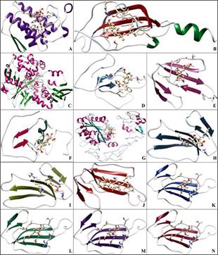 Fourteen cobra (Naja naja L.) venom toxic proteins viz., phospholipase A2, long neurotoxin 1, long neurotoxin 2, long neurotoxin 3, long neurotoxin 4, long neurotoxin 5, acetylcholinesterase, L-aminoacid oxidase, cobramin A, cobramin B, cytotoxin 3, cobrotoxin, serine protease and proteolase were selected as the receptor molecules for docking. The three-dimensional (3D) structures of phospholipase A2 (1A3D) and cobrotoxin (1COD) were downloaded from RCSB Protein Data Bank. The modelled structures of the proteins such as cobramin A (Swiss-prot ID P01447), cobramin B (Swiss-prot ID P01440), cytotoxin 3 (Swiss-prot ID P24780), long neurotoxin 1 (Swiss-prot ID P25668), long neurotoxin 2 (Swiss-prot ID P25669), long neurotoxin 3 (Swiss-prot ID P25671), long neurotoxin 4 (Swiss-prot ID P25672), long neurotoxin 5 (Swiss-prot ID P25673) and proteolase (Swiss-prot ID Q9PVK7) were retrieved from SWISSMODEL repository. The 3D structure of serine protease was created using SWISSMODEL [8]. The primary sequence of serine protease of N. naja was retrieved from Swiss-prot (P86545) and submitted in BLASTp sequence similarity search tool. The template 1BQY_A was taken with 80% similarity and the protein was modelled.