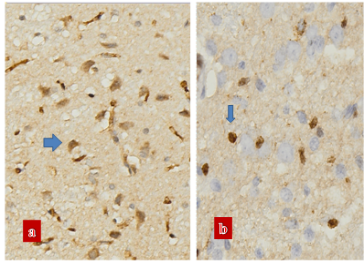 Fig. 1: Photomicrograph of immunohistochemistry, under light microscopes magnification 400x. a. Cell with immunoexpression of Nestin b. Cell with immunoexpression of Ki-67