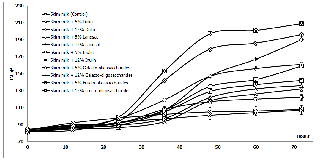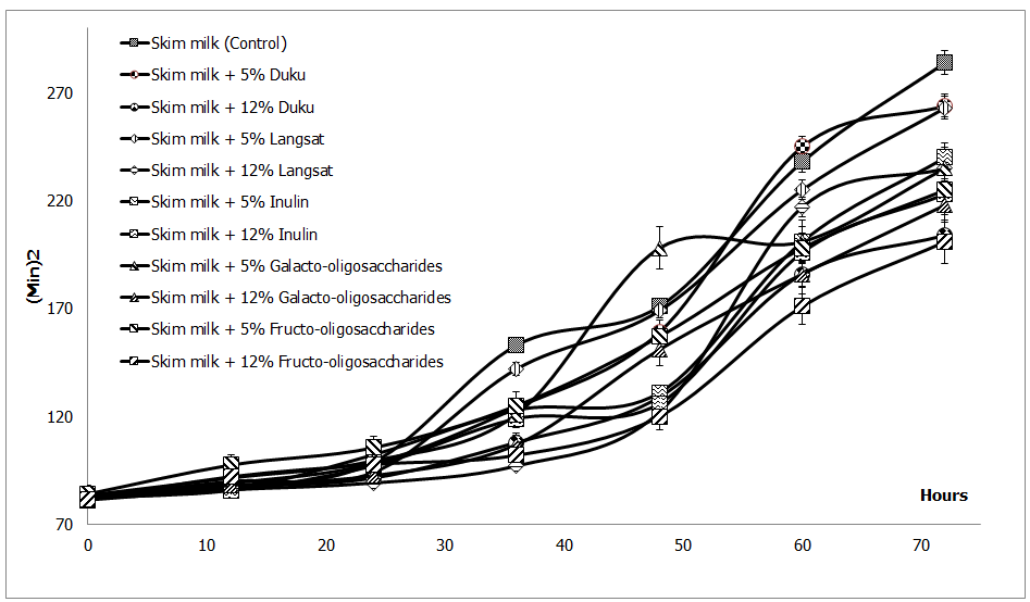 Among the carbohydrate sources tested, a 12% supplementation of FOS, duku and GOS showed to be most effective in enhancing the growth rate of B. longum in skimmed milk. The mean doubling time of B. longum after 72 h of incubation was significantly reduced (p<0.05) compared to the controls. The addition of 12% FOS significantly decreased (p<0.05) the doubling time value as compared to the other samples. The supplementation of 12% GOS and duku also decreased the doubling time value after 72 h of fermentation. The supplementation of 5% and 12% oligosaccharides extracted from duku also helped in stimulating the growth of B. longum when added to skimmed milk. It showed a similar pattern of positive results as observed in the supplementation of 12% FOS. As compared with 12% supplementing of GOS, inulin and other carbohydrate sources tested, their mean doubling time was shorter than control except for the 12% supplementation of FOS.