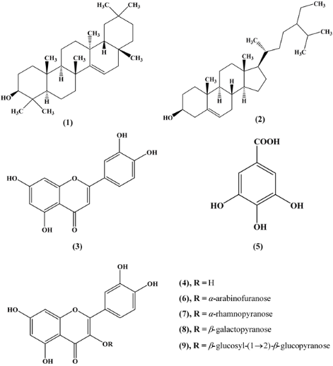 Results: A total of nine compounds were isolated and identified. Taraxerol (1), a pentacyclic triterpene, and β-sitosterol (2) were isolated from HE. Investigation of polar fractions of DEE yielded six flavonoids and a phenolic acid, namely luteolin (3), quercetin (4), gallic acid (5), avicularin (6), quercitrin (7), hyperoside (8) and quercetin-3-O-β-sophoroside (9).