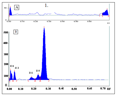 Fig. 4: Forced degradation of Zanamivir by HPTLC 1. A-Blank HCl, B-Sample treated with HCl 2. A-Blank NaOH, B-Sample treated withNaOH 3. Blank H2O2, B-Sample after oxidation 4. Blank MeOH, B-Sample after exposing to heat 5. A-Blank MeOH, B-Sample after exposing to light