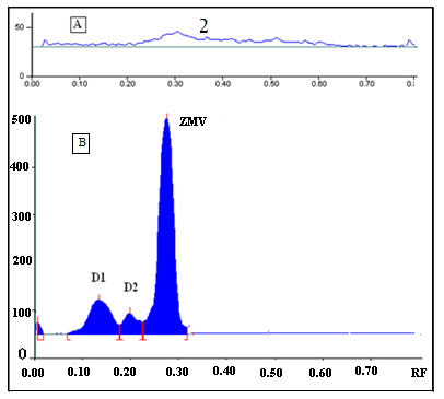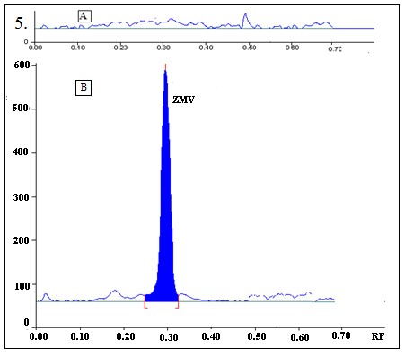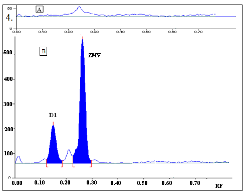 The TLC procedure was optimized with a view to develop a stability indicating assay method. Both the pure drug and the degraded products were spotted on the TLC plates and run in different solvent systems. Initially chloroform: methanol in varying ratios was tried. The mobile phase chloroform: methanol 4.5:0.5 (v/v) was tried. The developed spot was diffused. To the above mobile phase, 0.1 ml acetic acid was added. Both the peaks were symmetrical in nature, and tailing was observed. To overcome this problem, the volume of acetic acid was increased to 0.3 ml, gave good resolution, sharp and symmetrical peak with Rf value of 0.29 for ZMV (fig. 2). Also, the spot for ZMV was compact and not diffused. It was observed that prewashing of TLC plates with methanol (followed by drying and activation) and pre-saturation of TLC chamber with mobile phase for 15 min ensure good reproducibility and peak shape of ZMV.