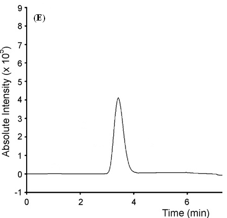 HPTLC has performed on 20 cm x 10 cm aluminum plates coated with silica gel aluminum plate 60F-254 (0.2 mm thickness E. Merck, Germany). ZMV was spotted in the form of bands of width 6 mm with Camagmicrolitre syringe using CamagLinomatV (Switzerland). A constant application rate of 150 nl/sec was employed, and space between two bands was 15 mm. The slit dimension was kept 6 mm x 0.45 mm micro, 20 mm/s scanning speed was employed. The mobile phase consisted of Chloroform: methanol: acetic acid (4.5:0.5:0.3v/v). The chromatogram was developed in twin trough glass chamber saturated with mobile phase using the linear ascending technique. The optimized chamber saturation time for mobile phase was 25 min at room temperature. The length of chromatogram run was approximately 80 mm. The system was found to give a compact spot for zanamivir (Rf value of 0.29±0.02). Subsequent to the development; TLC plates were dried in current of air with the help of an air dryer. Densitometric scanning was performed using Camag TLC scanner III in the absorbance mode at 230 nm. The source of radiation utilized was deuterium lamp emitting a continuous UV spectrum in the range of 200-400 nm.