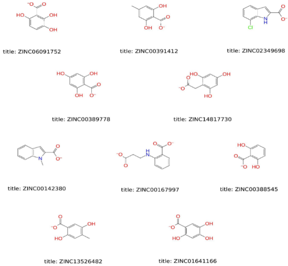 Fig. 1: Representing top 10 hit compounds obtained from virtual screening, 2D structures and their corresponding ZINC ids