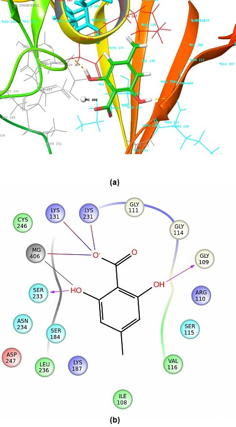 Fig. 2: (a) Binding pattern of MKK4 and, (b) 2D-interaction map of MKK4, obtained through XP docking of ZINC06091752. It illustrates existing hydrogen bonds and ionic interactions between ligand and MKK4. Lys 231 and Ser 233 shows hydrogen bonding between ligand and receptor whereas Lys 131 and Lys 231 making ionic interaction between ligand and MKK4
