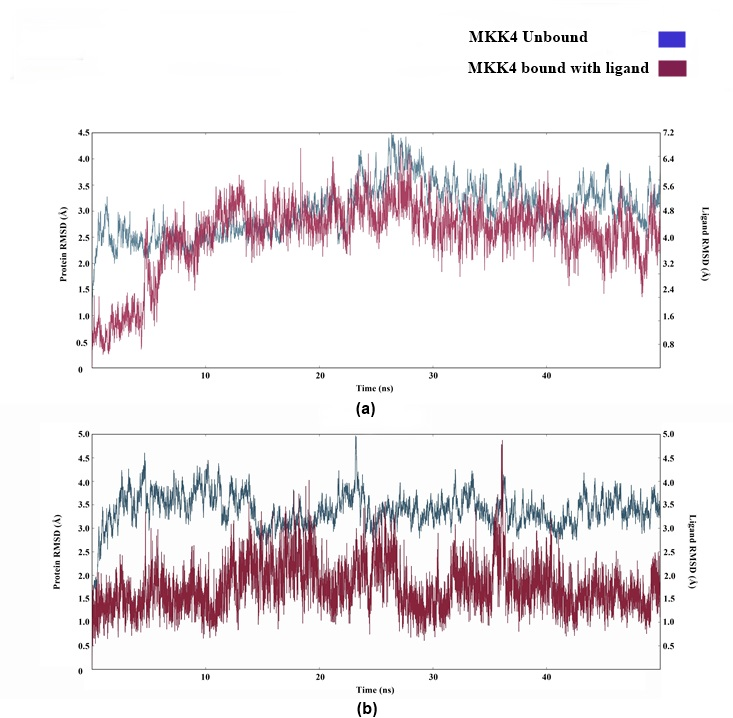 Fig. 4: Illustrating RMSD plot obtained from 50 ns MD simulation run. (a) RMSD plot of the MKK4-ZINC06091752 system (magenta), and MKK4 without ligand (blue). (b) RMSD plot of the MKK4-ZINC00391412 system (magenta), and MKK4 without ligand (blue). X and Y axes represent time (ns), and root means square deviation (RMSD), respectively