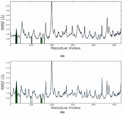 Fig. 5: Illustrating RMSF plot MD simulation run for 50 ns. Blue color represents the unbound MKK4 and green colors shows the ligand contact. (a) ZINC06091752, (b) ZINCC00391412. X and Y axes represent residue index and RMSF, respectively
