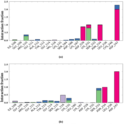 Fig. 7: Protein-ligand contact plot for 50 ns MD simulation. Protein-ligand contact plot shows the binding interactions, hydrogen bond (green), ionic interaction (pink), water bridge (blue) and hydrophobic interaction (purple). (a) ZINC06091752, (b) ZINCC00391412