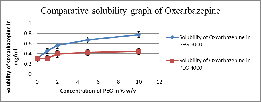 Preliminary solubility analysis was carried out to screen the most appropriate carriers wherein polyethylene glycol 4000 and polyethylene glycol 6000 were used. The results of the phase solubility revealed that both polyethylene glycol 4000 and polyethylene glycol 6000 enhance the solubility of oxcarbazepine significantly. More pronounced and linear results were obtained for solubility analysis from polyethylene glycol 6000 and hence it was selected as the carrier for the preparation of solid dispersion of oxcarbazepine (fig. 1).