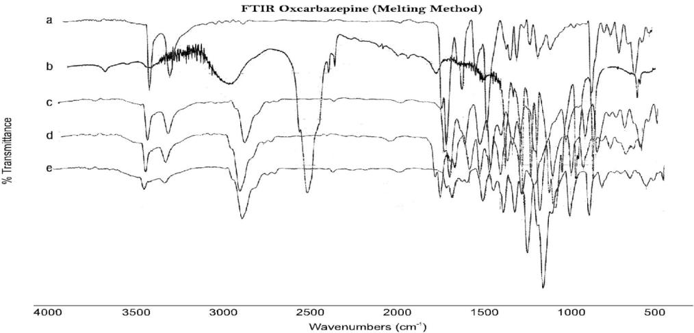 Fig. 2: FTIR curves melting method a) Pure drug oxcarbazepine b) Polyethylene glycol c) SD 1:1 d) SD 1:2 e) SD 1:5