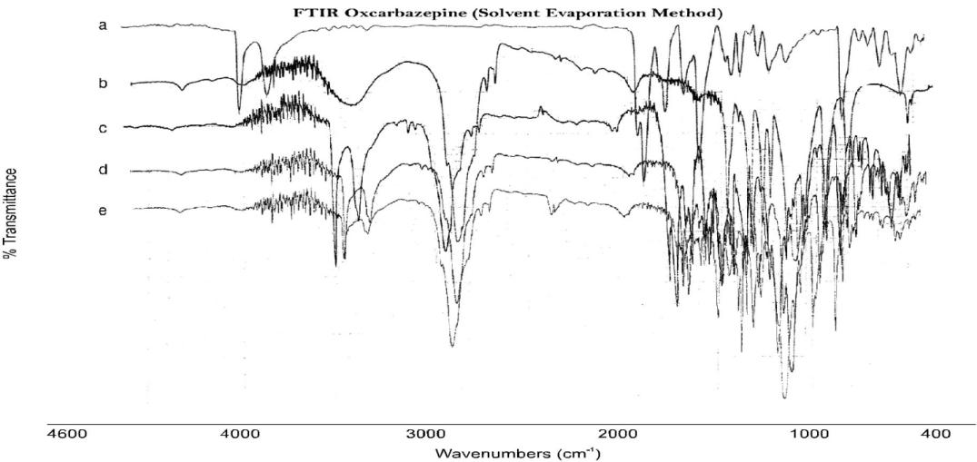 Fig. 3: FTIR curves solvent evaporation method a) Pure drug oxcarbazepine b) Polyethylene glycol c) SD 1:1 d) SD 1:2 e) SD 1:5