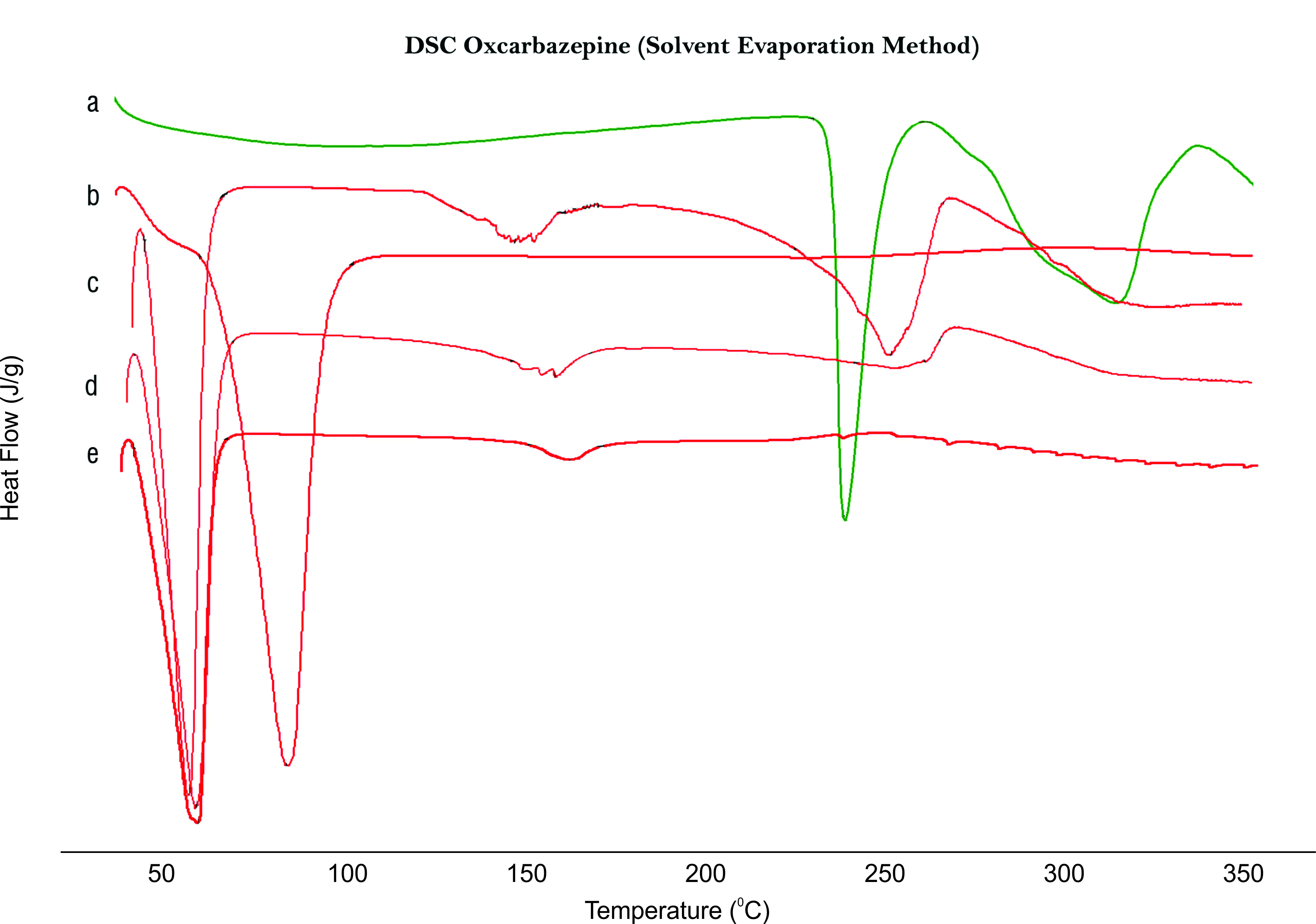 Fig. 5: DSC Thermogram solvent evaporation method a) Pure drug oxcarbazepine b) Polyethylene glycol c) SD 1:1 d) SD 1:2 e) SD 1:5