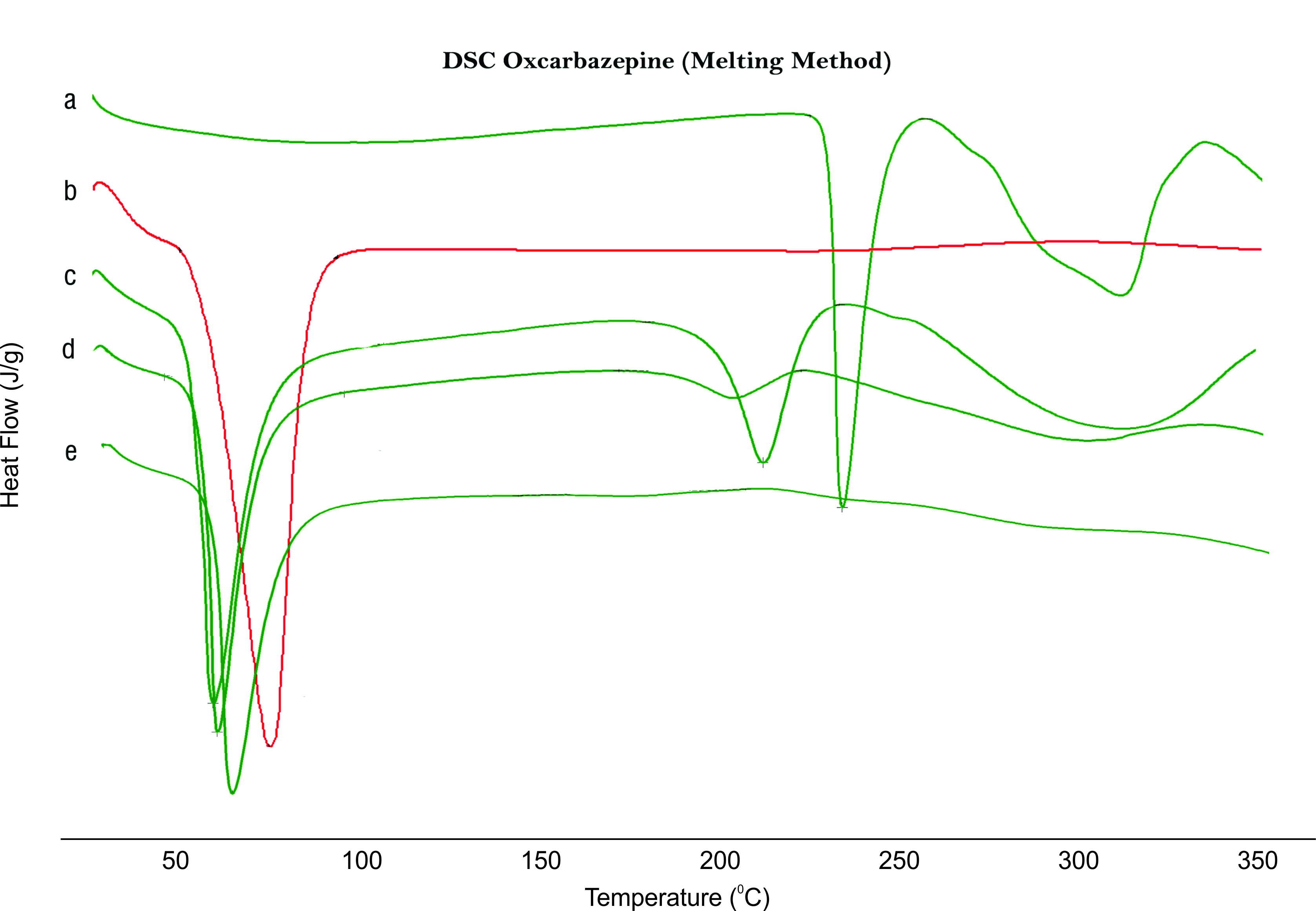 Fig. 4: DSC Thermogram melting method a) Pure drug oxcarbazepine b) Polyethylene glycol c) SD 1:1 d) SD 1:2 e) SD 1:5