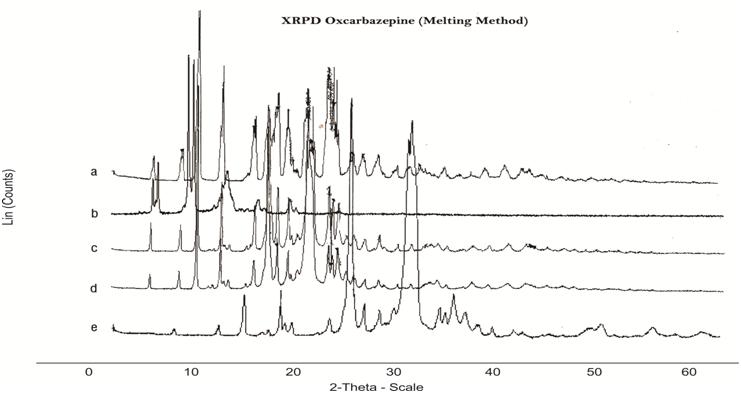Fig. 6: PXRD melting method a) Pure drug oxcarbazepine b) Polyethylene glycol c) SD 1:1 d) SD 1:2 e) SD 1:5