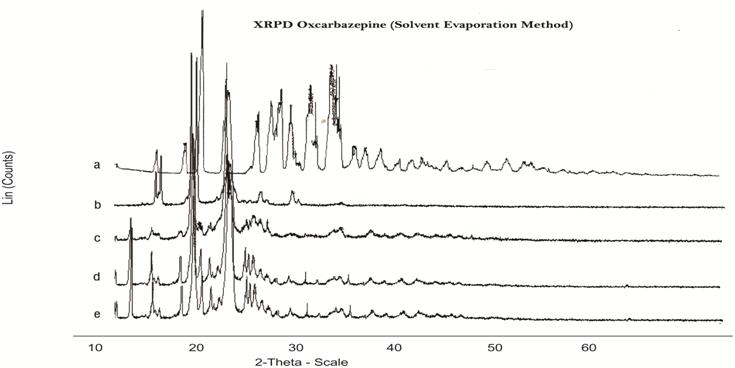 Fig. 7: PXRD Solvent evaporation method a) Pure drug oxcarbazepine b) Polyethylene glycol c) SD 1:1 d) SD 1:2 e) SD 1:5