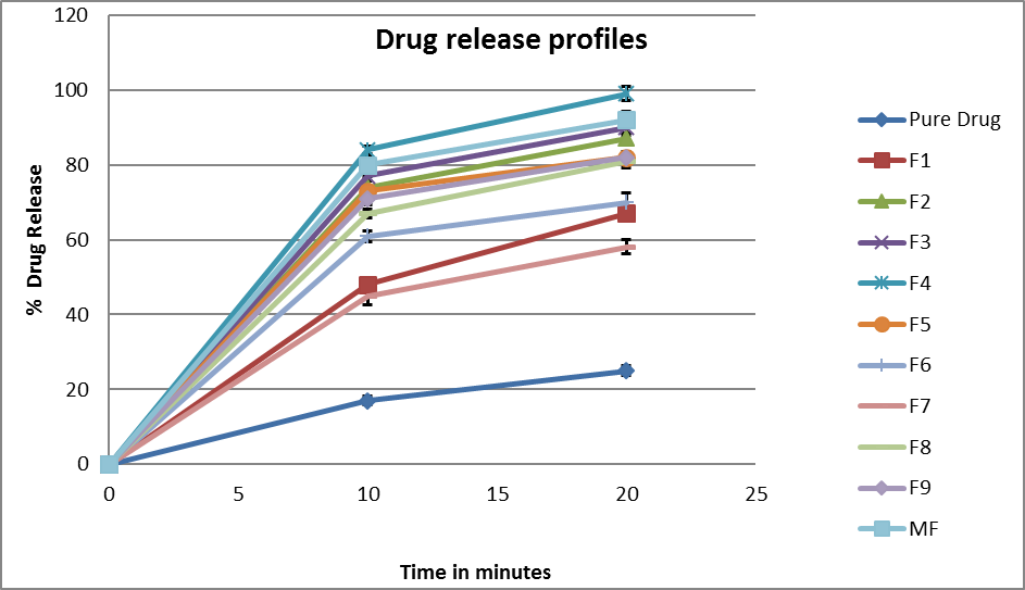 Fig. 9: The drug release profiles of oxcarbazepine pure drug, oxcarbazepine all formulations and marketed formulation, mean±SD, n=3