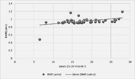 Fig. 3: Correlation between 25-OH vitamin D and BMD (spine)