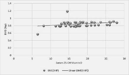 Fig. 4: Correlation between 25-OH vitamin D and BMD (hip)