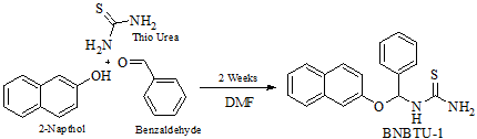 The ligand 1-(naphthalein-2-yloxy)(phenyl)(methyl) thiourea (BNBTU) was synthesized by Mannich condensation reaction between 2- naphthol, benzaldehyde and thiourea in 1:1:1 molar ratio. 2-naphthol (5g, 0.1mmol), was mixed with benzaldehyde (3.68g, 0.1mmol) followed by adding thiourea (2.5g, 0.1mmol) in DMF solution at room temperature with constant stirring for 24hrs.