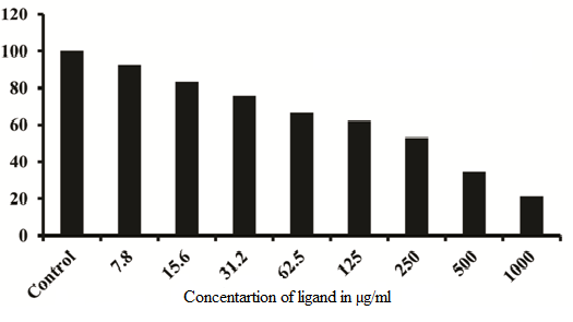 When the concentration of the ligand goes beyond 250 µg/ml, more than 50 % of the cells shown ruined structure. Based on the studies, scientists agreed that Mannich bases having the potential to inhibit the proliferation of cancer cells [26]. The ligand had shown greater effect against cancer cells than normal cells (Fig. 3).