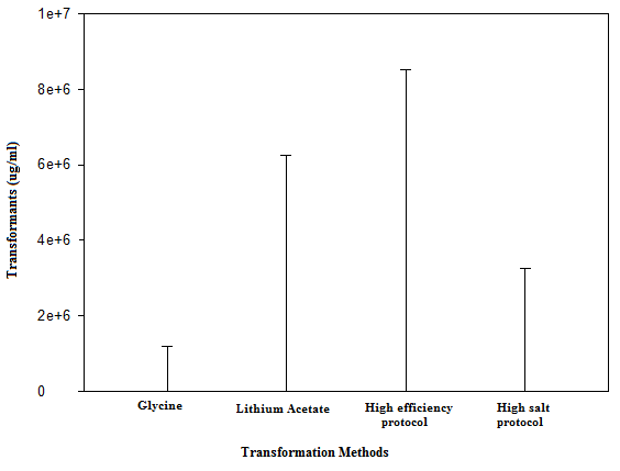 Fig. 1: Transformation efficiencies with different methods of L. plantarum strain