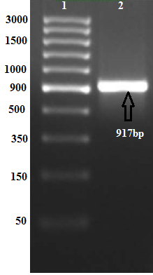 PCR amplification of bla gene fragments was carried out using the primer sense and antisense primers under standard conditions as previously described. The quality of pUC18 plasmid (fermentas) was evaluated by agarose gel electrophoresis, indicating relative purity. Samples of the PCR products of 10ul were analyzed on a 1.5% agarose gel and stained with ethidium bromide. Lane 1 shows size markers of a DNA ladder; lane 2 is the position of migration of the bla gene product (predicted size, 917 bp). Gels were photographed under UV light on a UVI-Tech BioImager (fig. 2).