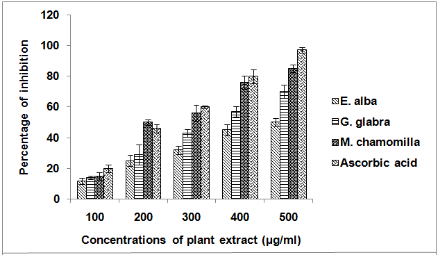 The free radical scavenging capacity of all the samples was tested using ABTS radical cation decolorization assays [43]. All the extract showed significant scavenging activity with the greatest extent. Among the solvent extract, M. chamomilla (79.58%) followed by G. glabra (65.03%) and E. alba (45.67%) showed ABTS*+scavenging activity. The standard vitamin E showed 99.6% scavenging activity against ABTS*+.