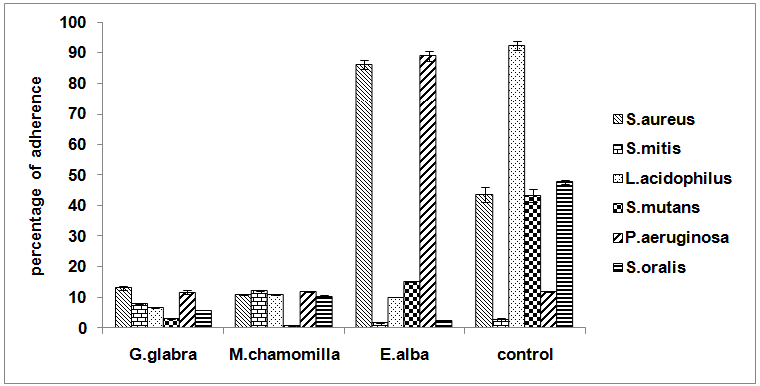 The antiadherence activity of methanol extracts of G. glabra, M. chamomilla and E. alba was carried out. All the methanolic plant extracts showed reduced percentage of adherence whereas positive control (Chloramphenicol) showed a higher percentage of adherence. This clearly indicates that the plant extracts can prevent bacterial colony formation in the oral cavity which leads prevent the oral infections.