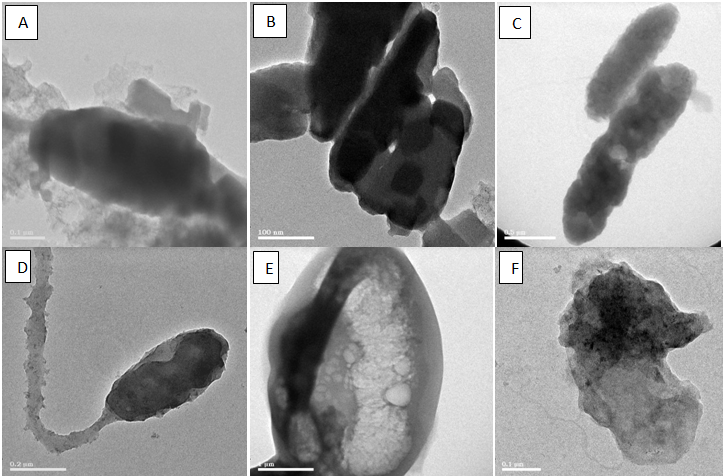 The untreated samples has a smooth and spherical surfaces whereas treated samples shows slight morphological changes (A and B) in the beginning followed by cell elongation (C) and oozing of cellular constituents (D) followed by cytoplasmic membrane and cell wall damage (E) and finally complete damage of the cell (F).