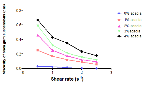 For the same concentrations of shea and acacia gums, the shea gum suspensions were observed to have lower apparent viscosities than acacia gum (table 3). These imply that the suspendability of shea gum is better than that of acacia gum since shea gum will have a higher actual viscosity and will be able to keep suspended drugs longer in suspension for a dose to be poured than acacia gum.