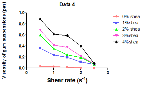 The viscosities of the suspensions formulated with the different concentrations of shea gum and acacia gum (1 %w/v, 2 %w/v, 3 %w/v and 4 %w/v) as suspending agents were determined using a viscometer at shear rates of 0.20 s-1, 0.40 s-1, 0.60 s-1, 1.0 s-1 and 2.0 s-1. The determinations were done in triplicates and the mean viscosities plotted against their respective shear rates.