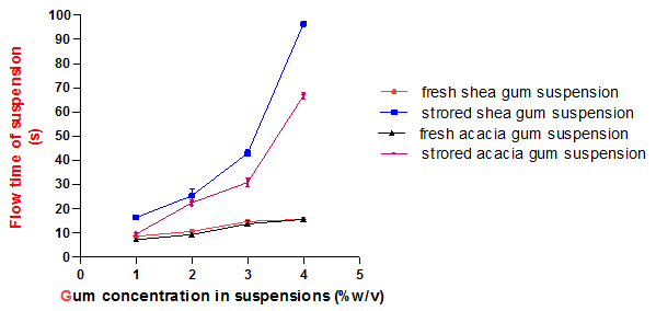 The flow time of the freshly prepared paracetamol suspension made with shea gum was found to be directly proportional to the concentration of gum. The time ranges from 9.30 s to 16.23 s for the various shea gum concentrations used (table 3). A similar trend was observed for suspensions made with acacia gum (table 3).