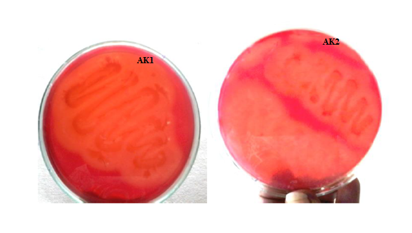 Fig. 1: Bacterial isolates AK1 and AK2 show clear zones around the colonies