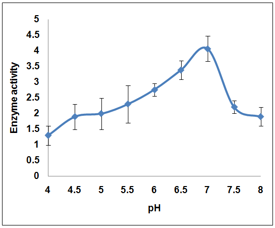 pH plays a major role in activity of any enzyme. Experiments were carried out to optimize the pH for enzyme activity at different pH ranging from 4 to 8. On increasing the pH from 4 to 7, the enzyme activity increased from 1.3 to 4.07 U/ml and on further increase in pH to 8, the enzyme activity decreased to 1.9 U/ml (fig. 2). The optimal initial pH for cellulase production by Bacillus isolated from artificial manure was reported as 6.0 by [18]. On controversy, Acharya and Chaudhary [19] found that B. subtilis isolated from a hot spring showed maximum cellulase activity at pH 9.0.