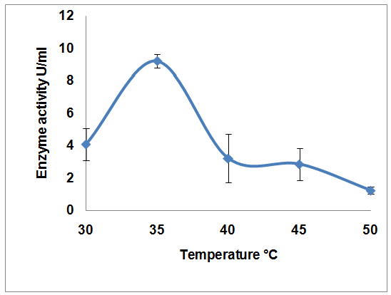 Temperature also has a significant effect on enzyme activity. Increase in temperature from 30 to 35 °C showed an increase in enzyme activity from 4.07 to 9.23 U/ml (fig. 3). On further increase, the enzyme activity decreased due to denaturation of the enzyme at a higher temperature. However, Sheikh et al. [20] observed that the enzyme activity of Bacillus sp. was gradually increased with the increase in temperature and the highest cellulase activity was found to be 3.5U/ml at 50 °C.