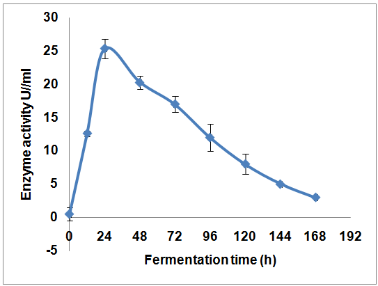 The CMCase activity was measured at various fermentation times (24, 48, 72, 96, 120, 144, 168 h) under optimized pH, temperature and substrate concentration. The results showed considerable variation in cellulase production at different times. The strain grew vigorously and the cellulase yield was high when the fermentation time was 24 h (fig. 5). Good CMCase activity (25.35 U/ml) was observed at 24 h cultivation, but it decreased continuously during the time from 24 h to 168 h. Similar results were obtained by Yang et al. [21]. They reported that Bacillus subtilis isolated from Tibetan Pig’s intestine showed maximum CMCase activity at 24 h of cultivation.