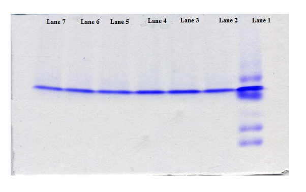 Fig. 6: Separation of enzyme samples on SDS PAGE gel, first lane-standard protein marker, second lane-crude enzyme, third lane-dialyzed sample, fourth to seventh lane-samples eluted at different NaCl strength (25 to 500 mM) in ion exchange chromatography