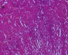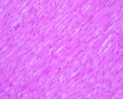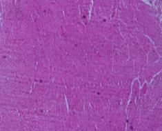 Microscopic examination of heart: Sections show wall of heart composed predominantly of thick myocardium consists of bundles of cardiac muscle fibers separated by fibrous band, forming syncytium. Nuclei of myocytes are centrally located. Endocardium is lined by single layer of mesothelial cells resting on a basement membrane. No significant pathology is seen in any of the sections examined. |