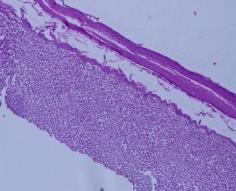 Microscopic examination of heart: Sections show wall of heart composed predominantly of thick myocardium consists of bundles of cardiac muscle fibers separated by a fibrous band, forming a syncytium. Nuclei of myocytes are centrally located. The endocardium is lined by single layer of mesothelial cells resting on a basement membrane. No significant pathology is seen in any of the sections examined. |